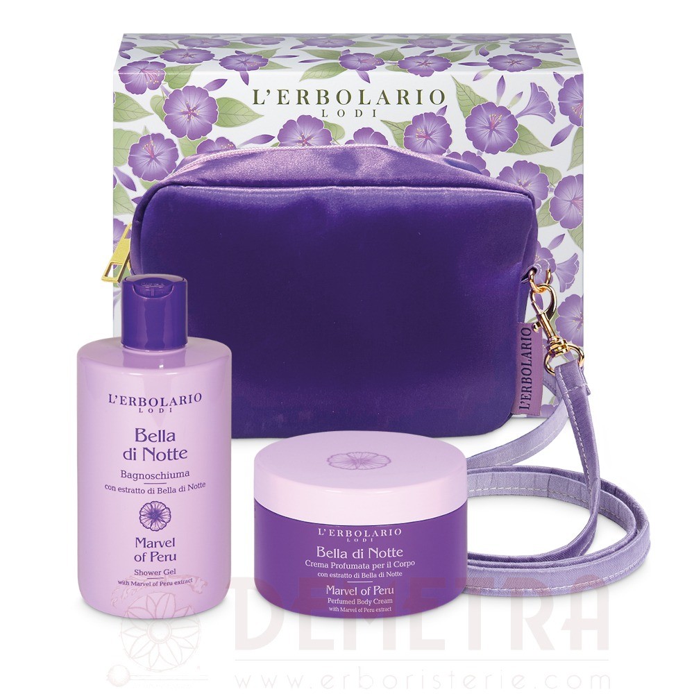 In questa raffinata pochette viola sono custoditi due cosmetici della linea Bella di Notte essenziali per la cura del corpo: il Bagnoschiuma e la Crema idratante profumata dalle note fiorite e vanigliate. Il kit è una perfetta idea regalo da donna, adatta a ogni occasione.