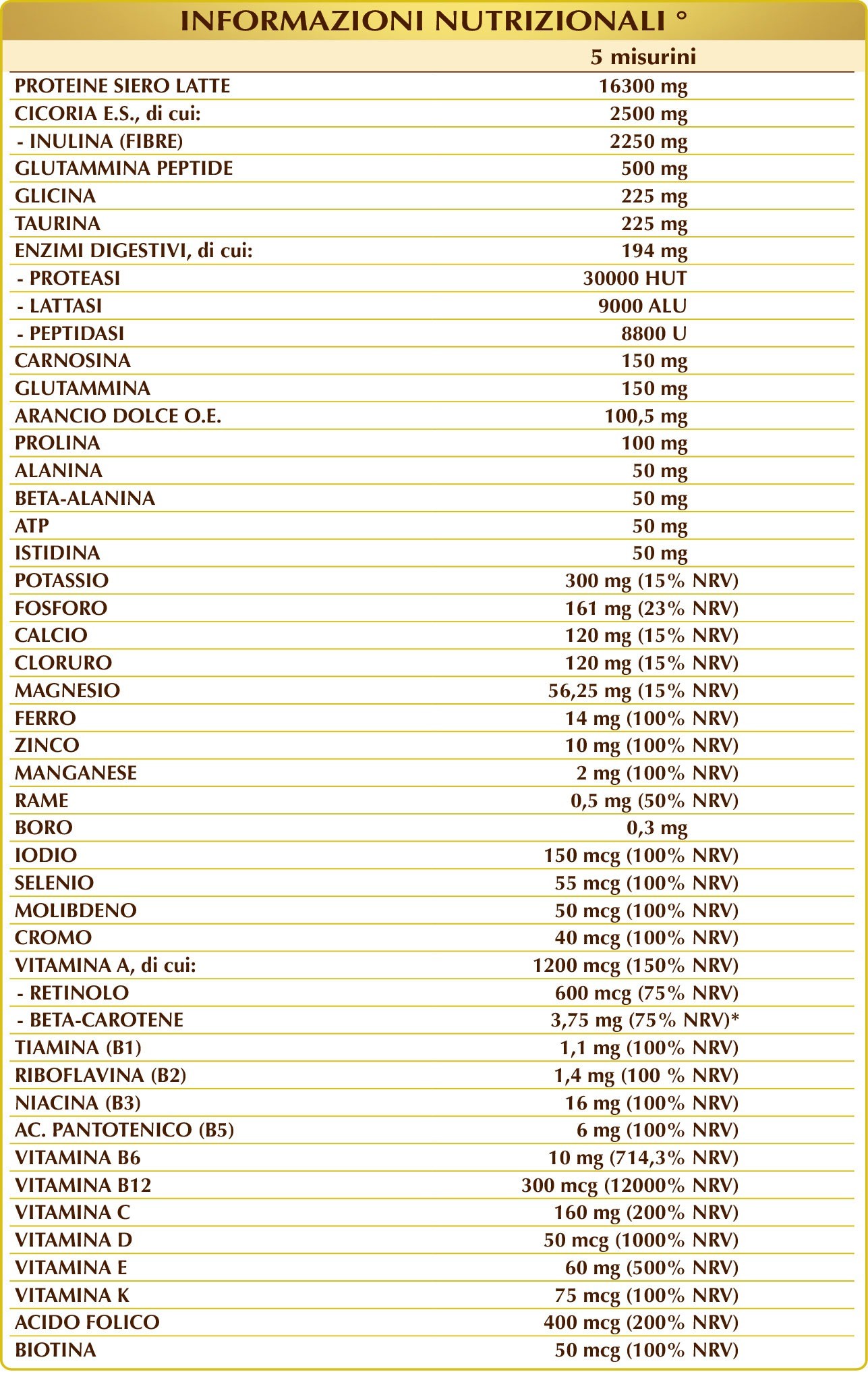Proteine del siero del latte, cicoria (Cichorium intybus) radici E.S. (titolato al 90% in inulina), calcio glicerofosfato, glutammina peptide, magnesio glicerofosfato, potassio citrato, potassio cloruro, glicina, taurina, vitamina C (acido ascorbico), (L-)carnosina, (L-)glutammina, vitamina E (acetato di DL-α-tocoferile), ferro gluconato, (L-)prolina; aroma naturale: arancio dolce (Citrus aurantium var. sinensis o dulcis) scorze dei frutti O.E; lattasi (100.000 ALU/g), zinco gluconato, ATP (adenosina trifosfato sale sodico), (L-)alanina, beta-alanina, (L-)istidina, proteasi (500.000 HUT/g), peptidasi (200.000 U/g), dunaliella (Dunaliella salina) tallo (alga) E.S. (titolato al 10% in beta-carotene), vitamina D3 (colecalciferolo 100.000 UI/g), manganese gluconato, vitamina B3 (nicotinamide), vitamina B6 attivata (piridossale 5-fosfato); edulcoranti di origine naturale: glicosidi steviolici da stevia e taumatina; vitamina B5 (pantotenato di calcio), vitamina A (acetato di retinile), rame gluconato, sodio borato, vitamina B2 attivata (riboflavina 5-fosfato di sodio), vitamina B1 (tiamina cloridrato), acido folico attivato (L-metilfolato di calcio), cromo picolinato, vitamina B12 attivata (5-deossiadenosilcobalamina, metilcobalamina), potassio ioduro, sodio molibdato, sodio selenito, vitamina K1 (fillochinone), biotina.