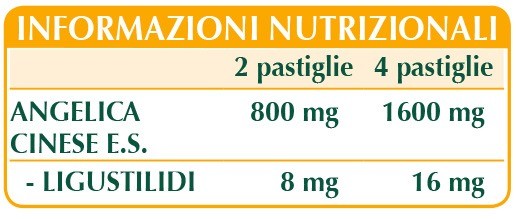 Angelica cinese (Angelica sinensis) radici E.S. (titolato all’1% in ligustilidi), cellulosa microcristallina°, gomma arabica°, silicio biossido°°, maltodestrine da mais o riso, magnesio stearato di origine vegetale°°.