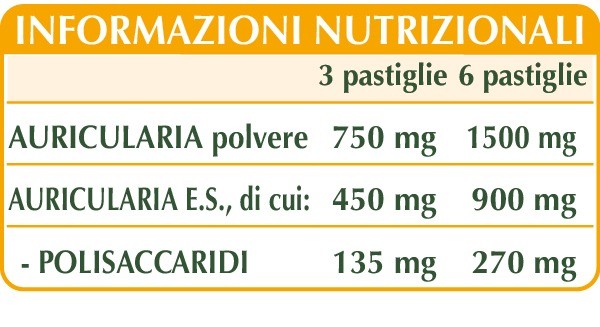 Auricularia (Auricularia auricula-judae Bull.) sporoforo (fungo) polvere, auricularia (Auricularia auricula-judae Bull.) sporoforo (fungo) E.S. (titolato al 30% in polisaccaridi), cellulosa microcristallina°, gomma arabica°, silicio biossido°°, magnesio stearato di origine vegetale°°.