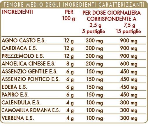 Agno casto (Vitex agnus-castus) frutti E.S., cardiaca (Leonorus cardiaca) erba con fiori E.S., prezzemolo (Petroselinum crispum) frutti E.S., cellulosa microcristallina°, gomma arabica°, angelica cinese (Angelica sinensis) radici E.S., assenzio gentile (Artemisia pontica) erba con fiori E.S., assenzio pontico (Artemisia vallesiaca) erba con fiori E.S., edera rampicante (Hedera helix) foglie E.S., papiro (Cyperus rotundus) radici E.S., calendula (Calendula officinalis) capolini (fiori) E.S., camomilla romana (Anthemis nobilis) capolini (fiori) E.S., verbena (Verbena officinalis) erba con fiori E.S., silicio biossido°°, magnesio stearato di origine vegetale°°.
