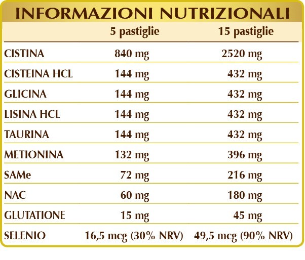 (L-)cistina, cellulosa microcristallina°, gomma arabica°, (L-)cisteina HCL o cloridrato, glicina, (L-)lisina HCL o cloridrato, SAMe (S-adenosil metionina disolfato tosilato), taurina, (L-)metionina, NAC (Nacetilcisteina), silicio biossido°°, glutatione ridotto, magnesio stearato di origine vegetale°°, (L-)seleniometionina.
