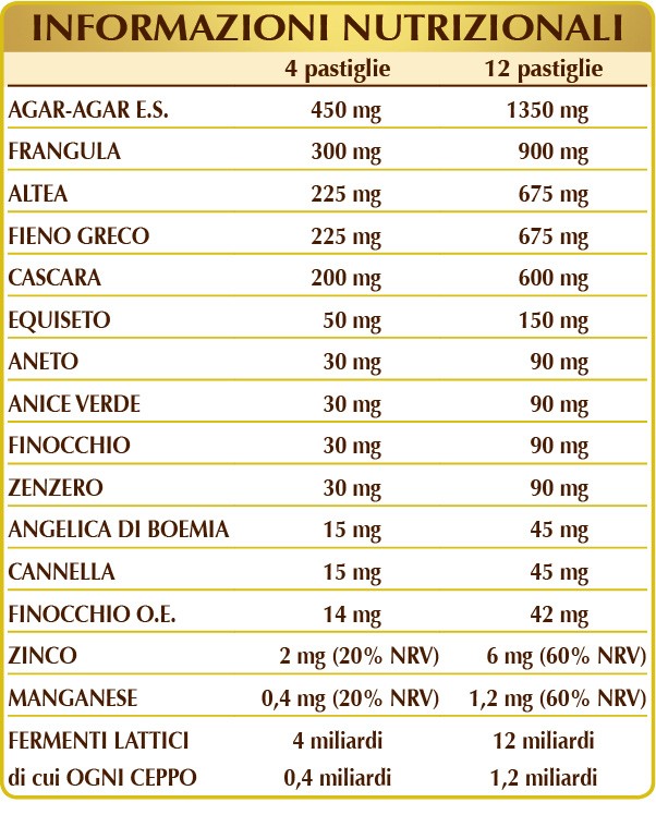 Agar-agar (Gelidium amansii) tallo (alga) E.S., frangula (Rhamnus frangula) cortecce Plv, altea (Althaea officinalis) radici Plv, fieno greco (Trigonella foenum-graecum) semi Plv, cascara (Rhamnus purshiana) cortecce Plv, cellulosa microcristallina°, gomma arabica°, equiseto o coda cavallina (Equisetum arvense) erba Plv, aneto (Anethum graveolens) frutti Plv, anice verde (Pimpinella anisum) frutti Plv, finocchio (Foeniculum vulgare) frutti Plv, zenzero (Zingiber officinalis) rizomi Plv, silicio biossido°°, miscela di fermenti lattici (titolata al 10% in ognuno dei seguenti ceppi: Bifidobacterium bifidum SD5215, breve SD5206, lactis SD5219; Lactobacillus acidophilus SD5212, brevis SD5214, bulgaricus SD5589, casei SD5213, paracasei SD5275, plantarum SD5209, rhamnosus SD5217), angelica di Boemia (Angelica archangelica) radici Plv, cannella (Cinnamomum zeylanicum) cortecce Plv, finocchio (Foeniculum vulgare) frutti O.E., zinco gluconato, manganese gluconato, magnesio stearato di origine vegetale°°.