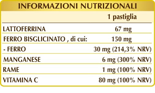 Integratore alimentare a base di ferro bisglicinato, fonte di ferro in forma organica chelata ad elevata biodisponibilità ben tollerata dall’organismo, con nutritivi coadiuvanti.