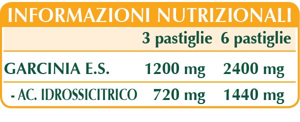 Garcinia (Garcinia cambogia) frutti E.S. (titolato al 60% in HCA o acido idrossicitrico), cellulosa microcristallina°, gomma arabica°, silicio biossido°°, magnesio stearato di origine vegetale°°.