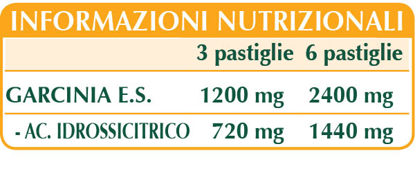 Garcinia (Garcinia cambogia) frutti E.S. (titolato al 60% in HCA o acido idrossicitrico), cellulosa microcristallina°, gomma arabica°, silicio biossido°°, magnesio stearato di origine vegetale°°.