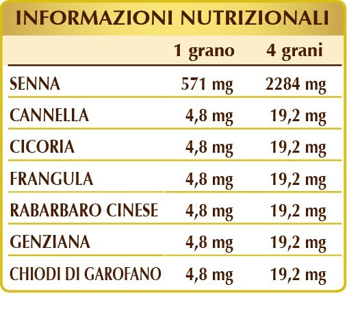 Senna, cicoria, frangula e rabarbaro favoriscono la regolarità del transito intestinale. Cannella, chiodi di garofano e genziana contribuiscono all’eliminazione dei gas intestinali e promuovono la funzione digestiva.