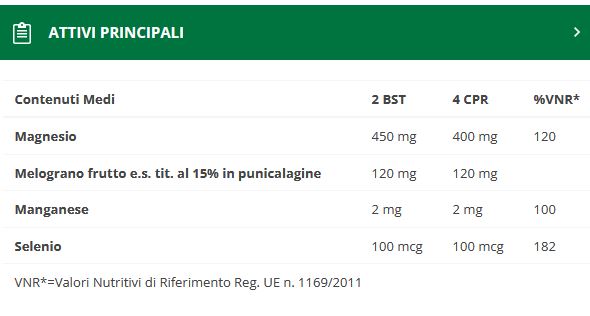 Magnesio citrato, agenti di carica: cellulosa, fosfato tricalcico; Fruttoligosaccaridi (13,6%), antiossidante: acido ascorbico; Magnesio pidolato, Magnesio carbonato, Magnesio marino (ossido, idrossido, solfato, carbonato e cloruro), Melograno (Punica granatum L.) frutto estratto secco titolato al 15% in punicalagine, agente antiagglomerante: sali di magnesio degli acidi grassi; gluconato di Manganese, stabilizzante: esteri di saccarosio degli acidi grassi; Selenito di sodio, colecalciferolo.