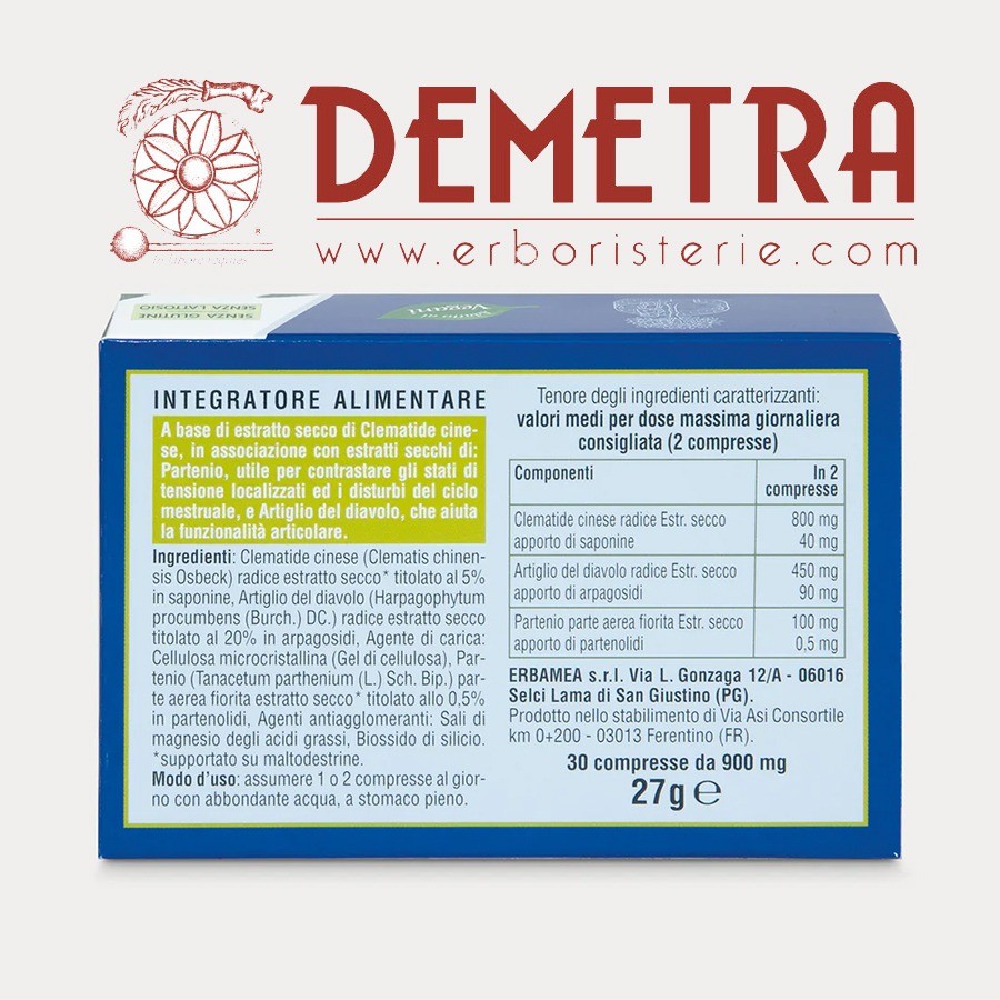 Contiene: estratti secchi titolati di: radici di Clematide cinese e Artiglio del diavolo e parti aeree fiorite di Partenio.