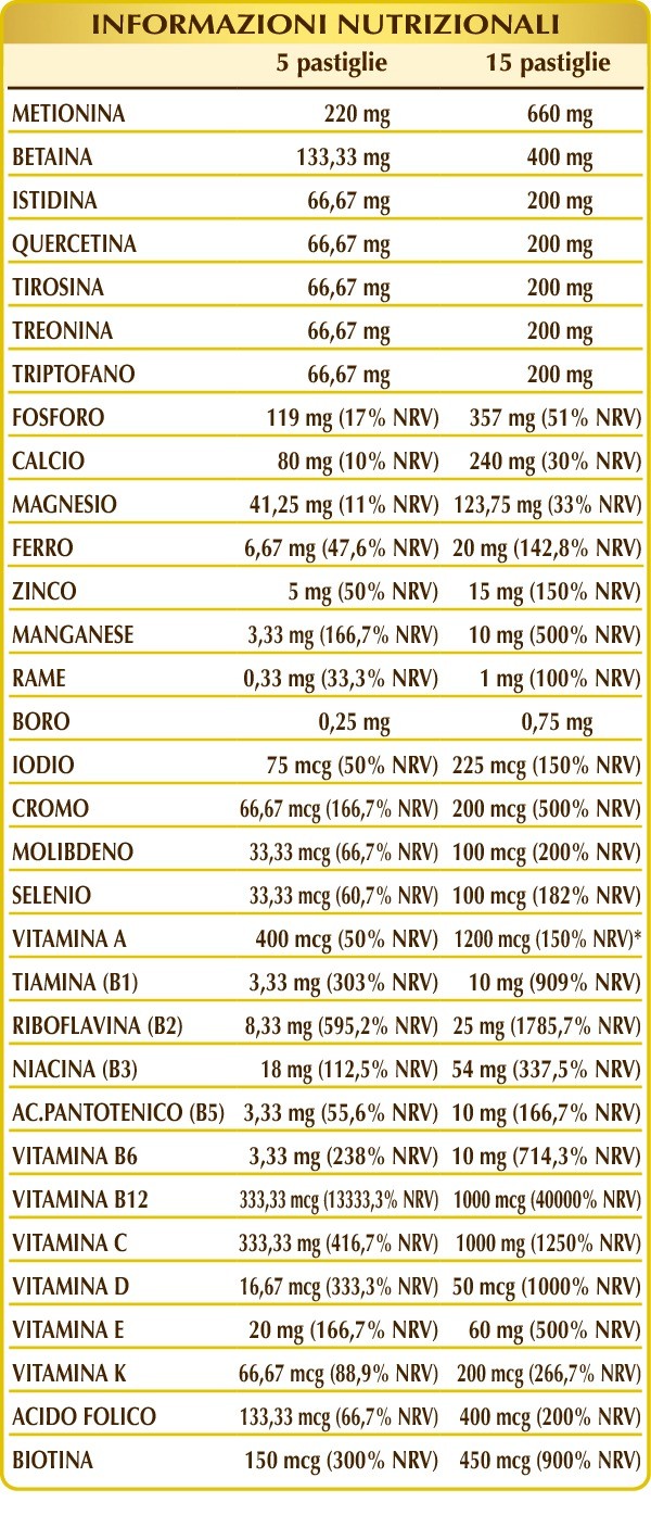 Calcio fosfato bibasico, magnesio glicerofosfato, vitamina C (acido ascorbico), cellulosa microcristallina°, gomma arabica°, (L-)metionina, betaina, (L-)istidina, quercetina, (L-)tirosina (da fermentazione), (L-)treonina, (L-)triptofano (da fermentazione), ferro gluconato, vitamina E di origine vegetale (acetato di D-α-tocoferile), zinco gluconato, silicio biossido°°, manganese gluconato, vitamina B3 (inositolo esanicotinato, nicotinamide), lichene (Cladonia rangiferina) tallo E.S. (titolato in vitamina D3 colecalciferolo 100.000 UI/g), vitamina B2 attivata (riboflavina 5-fosfato di sodio), vitamina B6 attivata (piridossale-5-fosfato), magnesio stearato di origine vegetale°°, vitamina B1 (tiamina cloridrato), vitamina B5 (pantotenato di calcio), vitamina A (acetato di retinile 500.000 UI/g), rame gluconato, sodio borato, cromo picolinato, vitamina B12 attivata (metilcobalamina, 5-deossiadenosilcobalamina), biotina, acido folico attivato (L-metilfolato di calcio), potassio ioduro, sodio molibdato, sodio selenito, vitamina K1 (fillochinone), vitamina K2 o MK-7 (menachinone) da Natto (semi di soia fermentati). E.S.= Estratto secco. °Agente di carica. °°Antiagglomerante.
