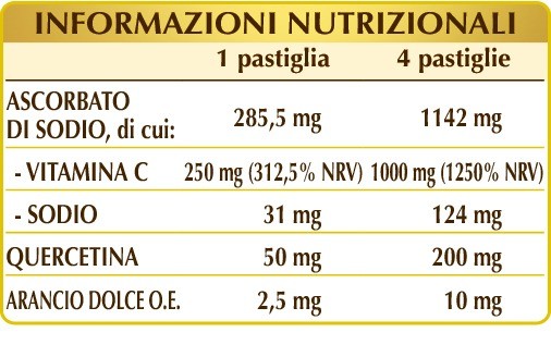 Vitamina C (sodio ascorbato), cellulosa microcristallina°, quercetina di origine vegetale, calcio fosfato bibasico°, gomma arabica°, silicio biossido°°, magnesio stearato di origine vegetale°°, aroma naturale: arancio dolce (Citrus aurantium var. sinensis o dulcis) scorze dei frutti O.E.
