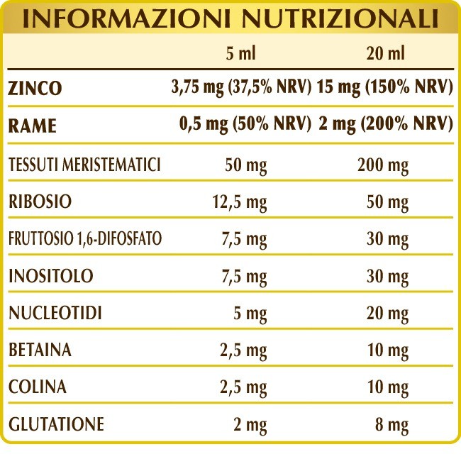 Glicerina vegetale bidistillata, acqua pura; tessuti meristematici freschi (1%): acero campestre (Acer campestris) gemme, faggio (Fagus sylvatica) gemme, quercia (Quercus peduncolata, sinonimo Quercus robur) gemme, ippocastano (Aesculus hippocastanum) gemme; zinco gluconato, ribosio, fruttosio 1,6-difosfato; correttore di acidità: acido citrico; inositolo, betaina citrato, colina tartrato; miscela di nucleotidi: AMP (adenosina monofosfato), CMP (citosina monofosfato), GMP (guanosina monofosfato), UMP (uridina monofosfato); glutatione, rame gluconato; edulcorante di origine naturale: taumatina (E957).